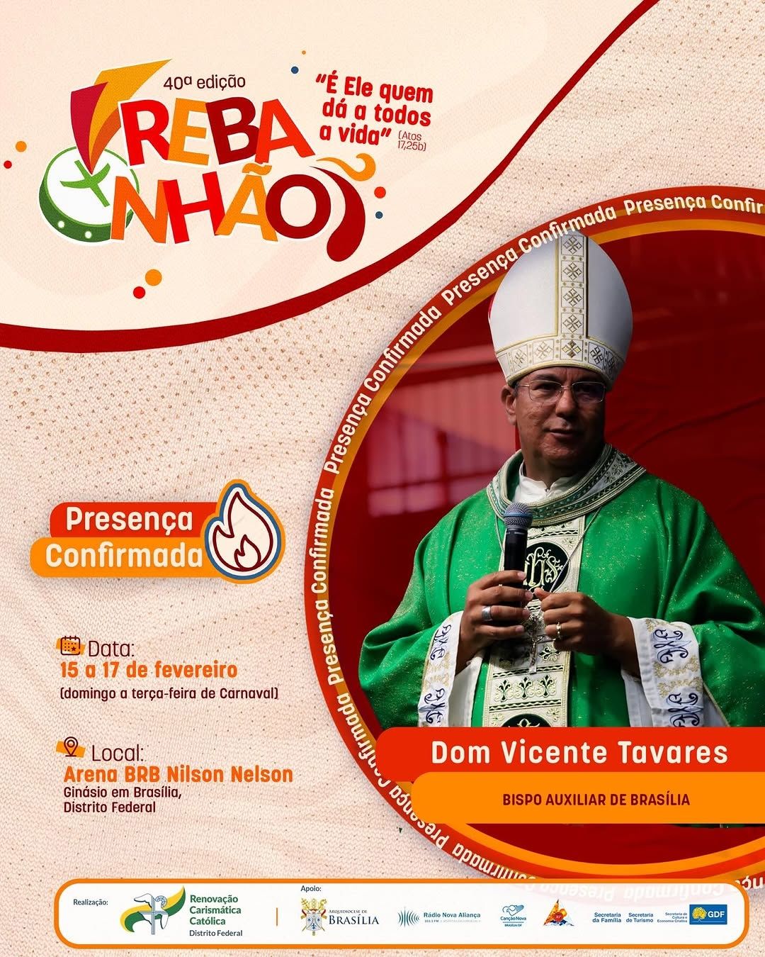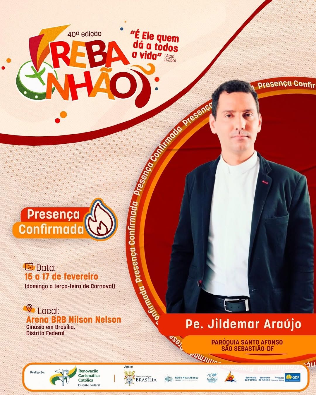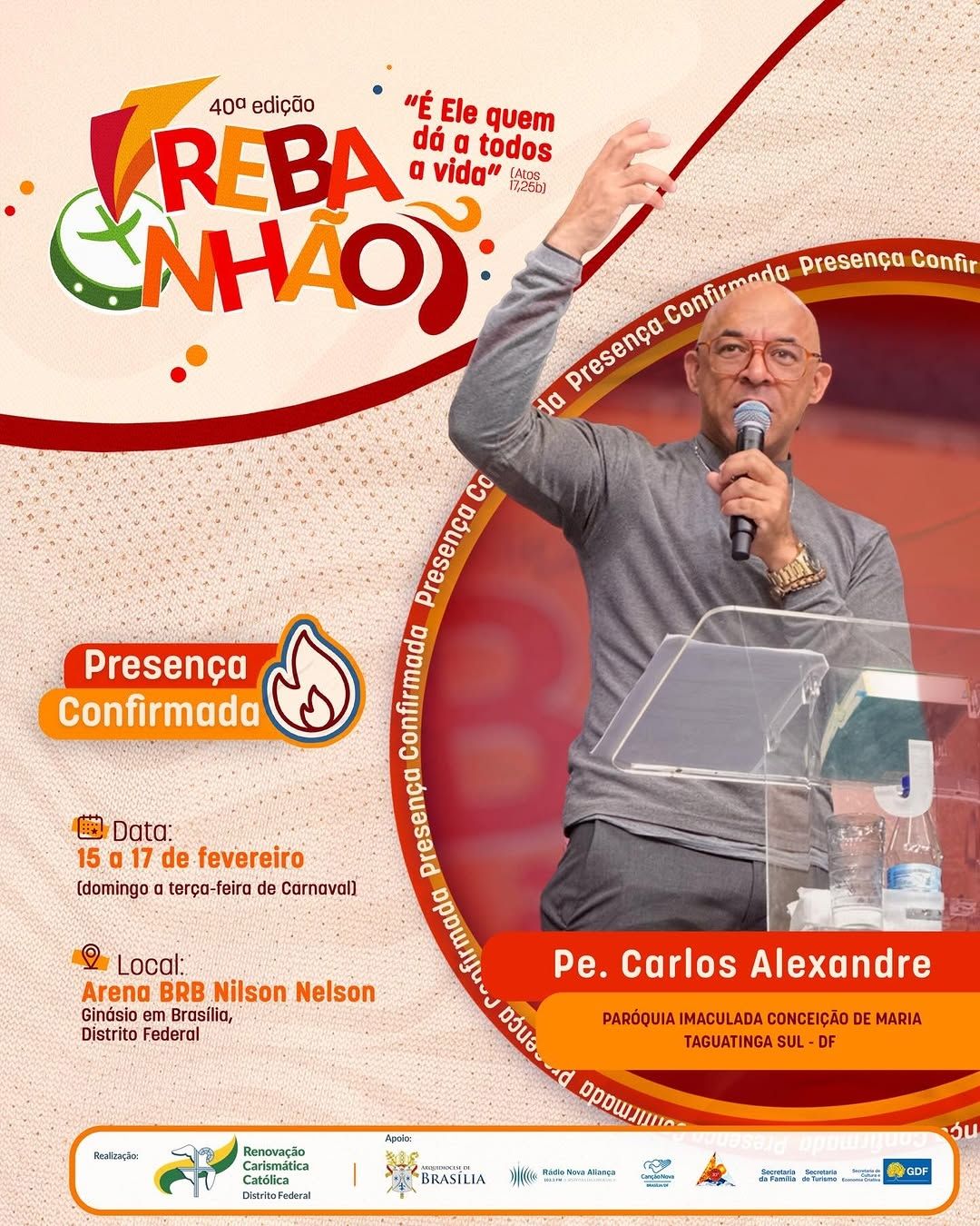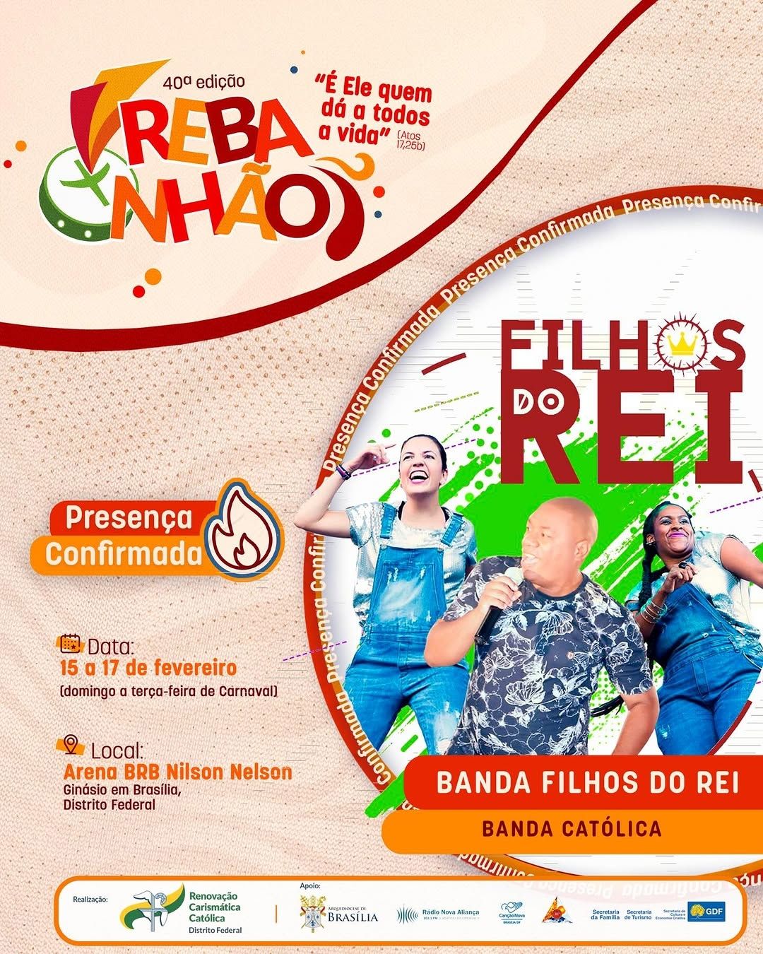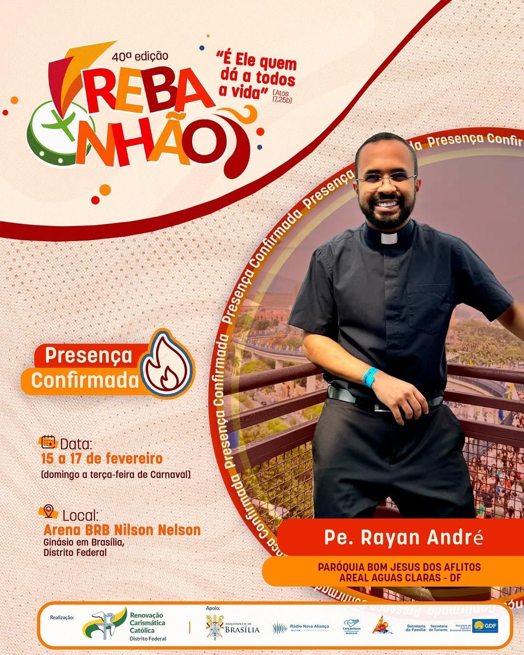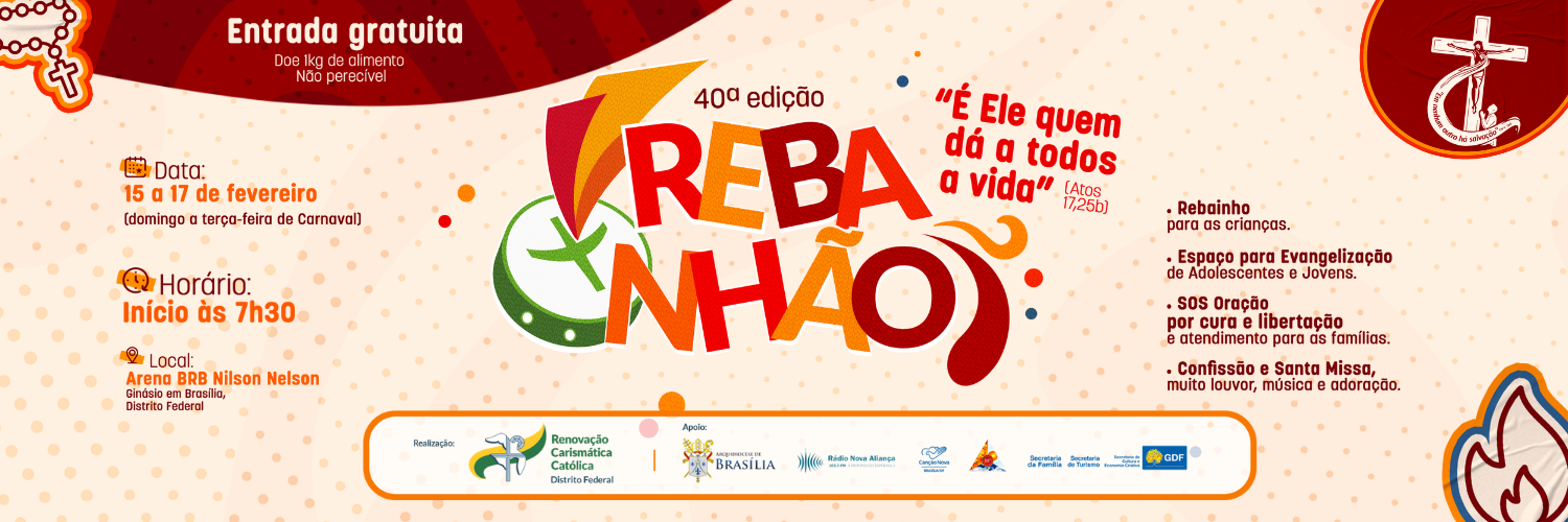 A 40ª edição do REBANHÃO acontecerá nos dias 15 a 17 de fevereiro de 2026, com o tema “É ELE QUEM DÁ A TODOS A VIDA” (Atos 17,25b). O evento é promovido pela Renovação Carismática Católica do Distrito Federal, com o apoio da Arquidiocese de Brasília. Esta será uma oportunidade de vivenciar um retiro de carnaval excepcional na presença de Deus. Serão dias de muita espiritualidade com momentos de pregação, adoração, confissão, louvor e Santa Missa.