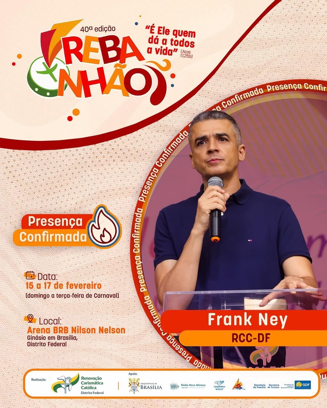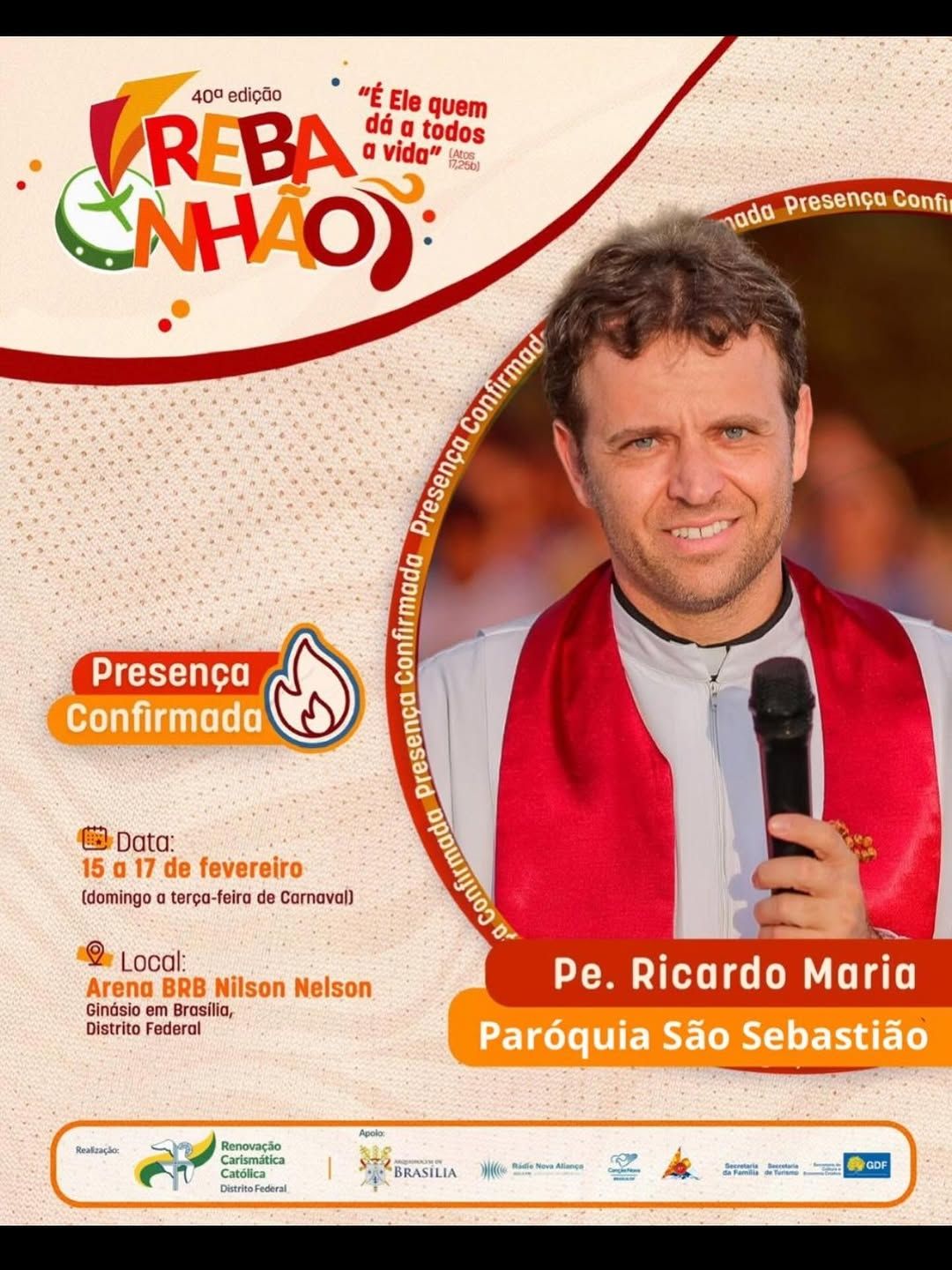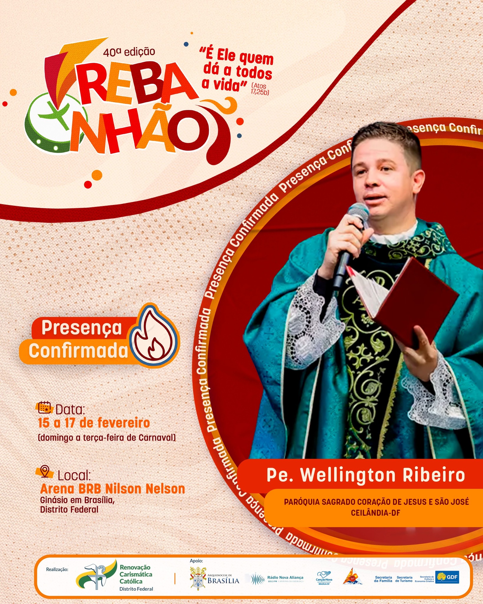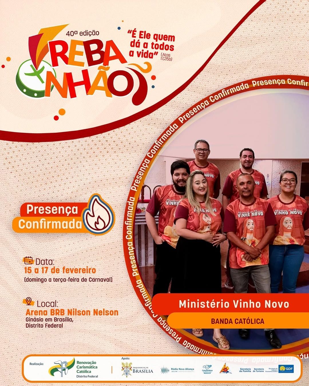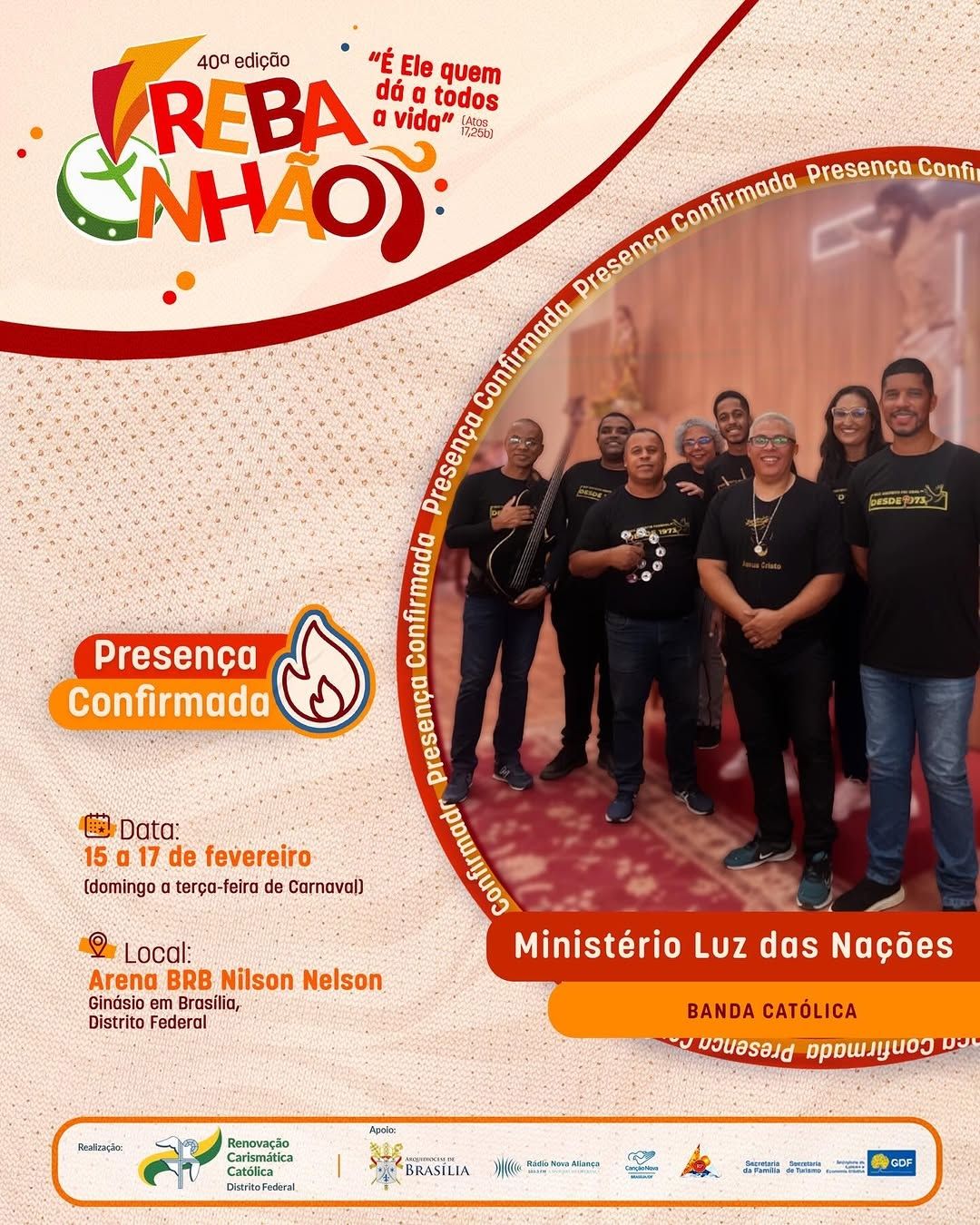 A 40ª edição do REBANHÃO acontecerá nos dias 15 a 17 de fevereiro de 2026, com o tema “É ELE QUEM DÁ A TODOS A VIDA” (Atos 17,25b). O evento é promovido pela Renovação Carismática Católica do Distrito Federal, com o apoio da Arquidiocese de Brasília. Esta será uma oportunidade de vivenciar um retiro de carnaval excepcional na presença de Deus. Serão dias de muita espiritualidade com momentos de pregação, adoração, confissão, louvor e Santa Missa.