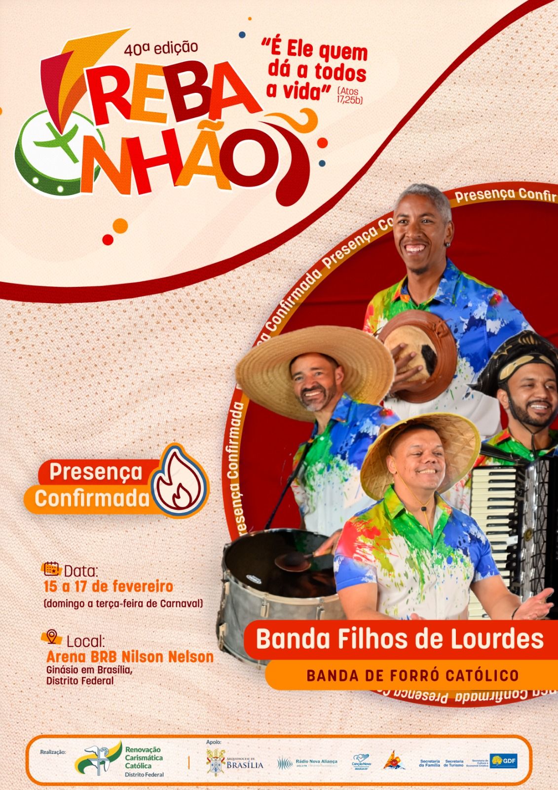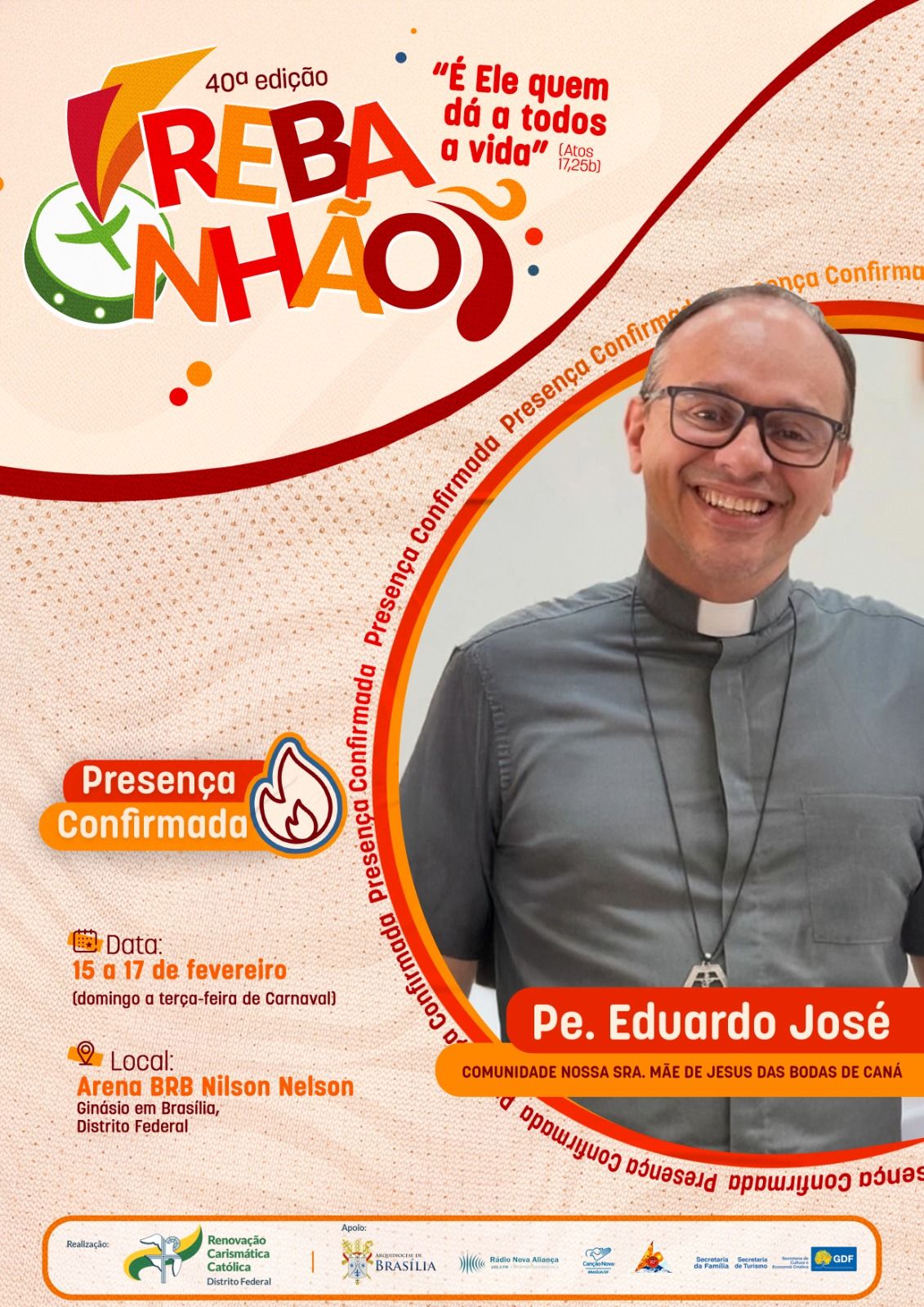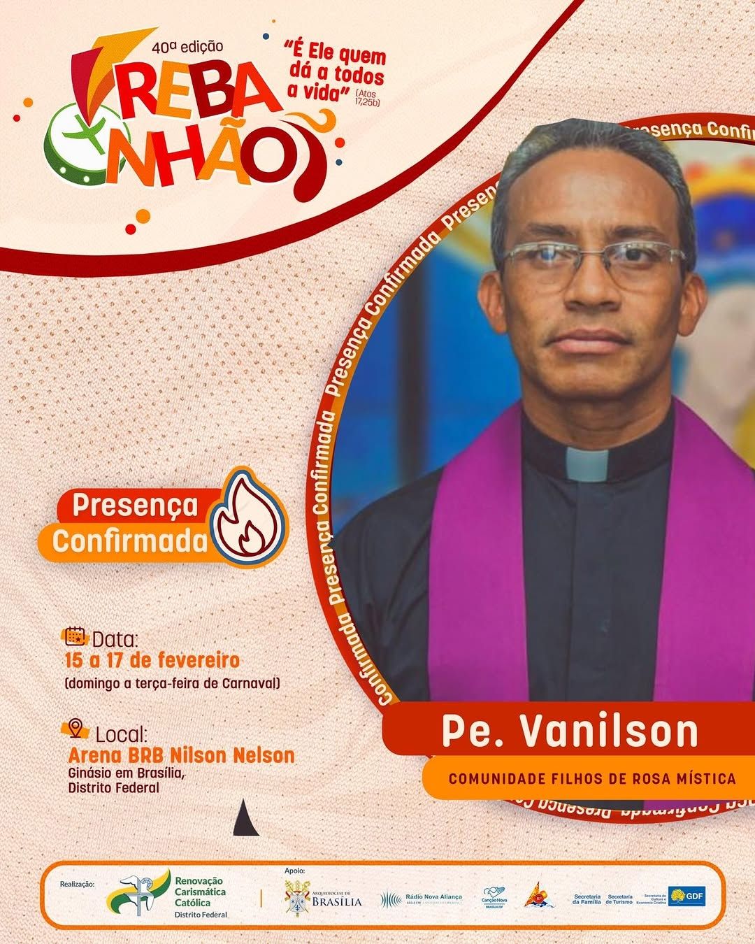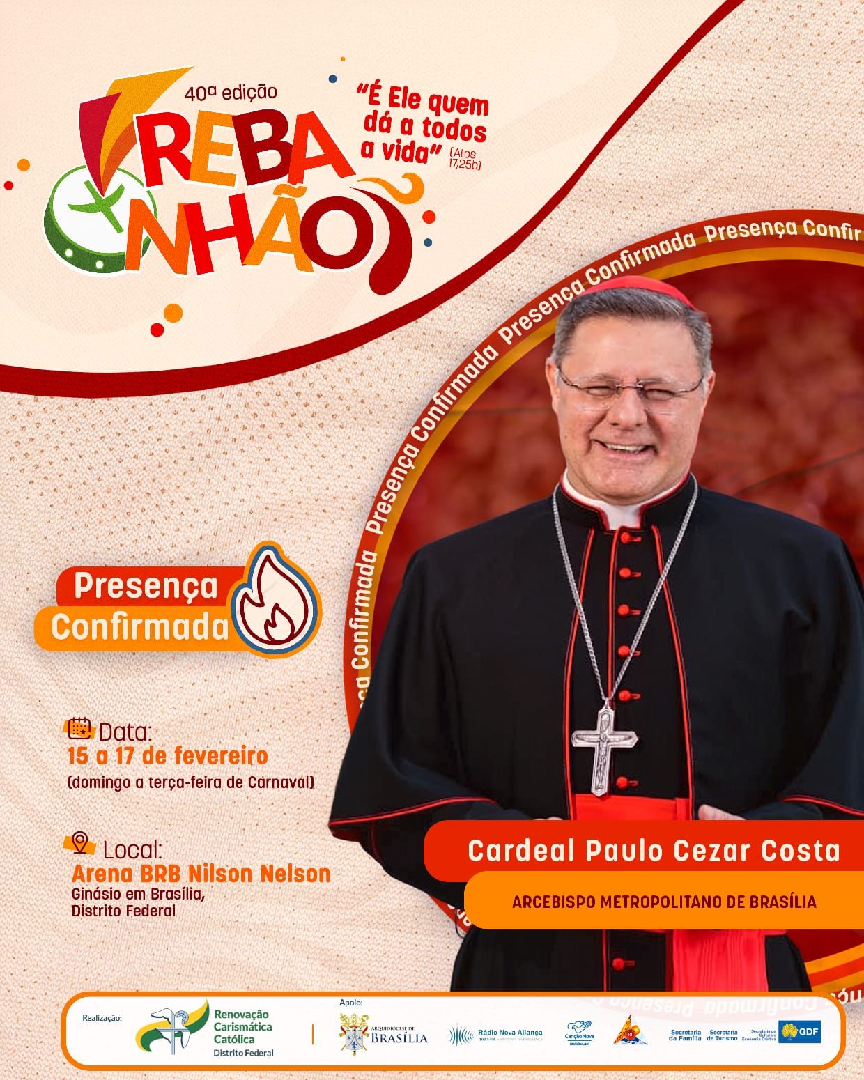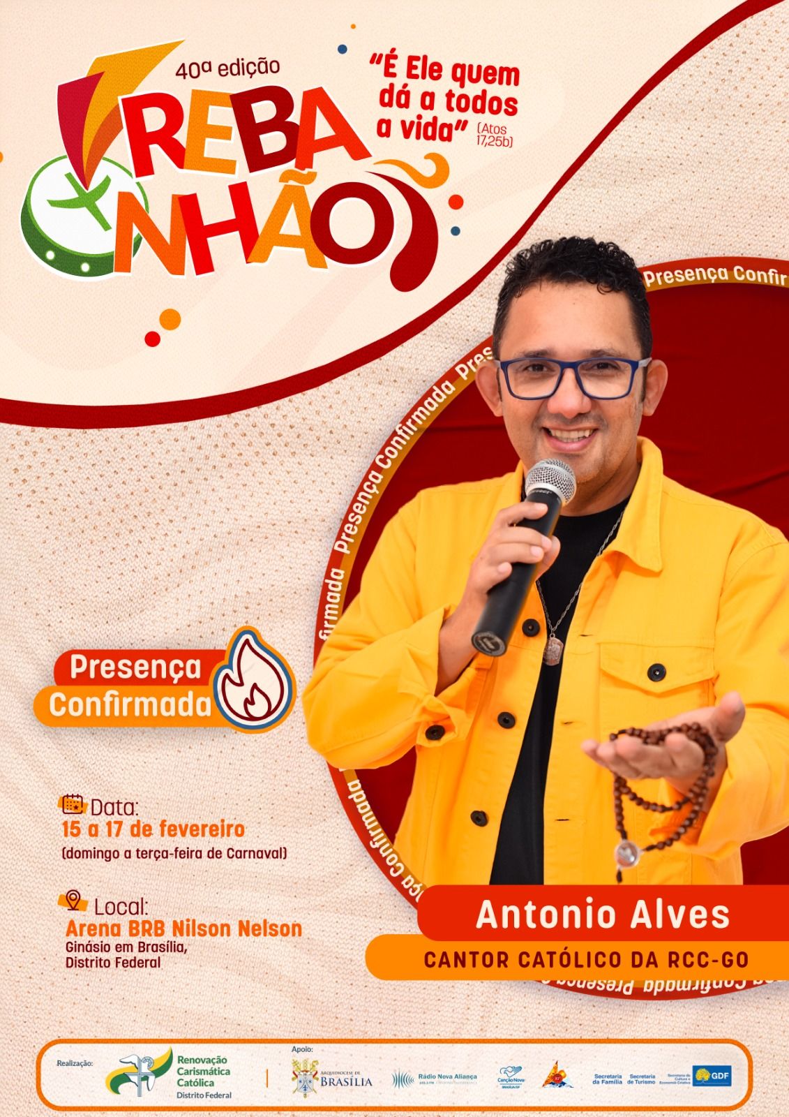 A 40ª edição do REBANHÃO acontecerá nos dias 15 a 17 de fevereiro de 2026, com o tema “É ELE QUEM DÁ A TODOS A VIDA” (Atos 17,25b). O evento é promovido pela Renovação Carismática Católica do Distrito Federal, com o apoio da Arquidiocese de Brasília. Esta será uma oportunidade de vivenciar um retiro de carnaval excepcional na presença de Deus. Serão dias de muita espiritualidade com momentos de pregação, adoração, confissão, louvor e Santa Missa.