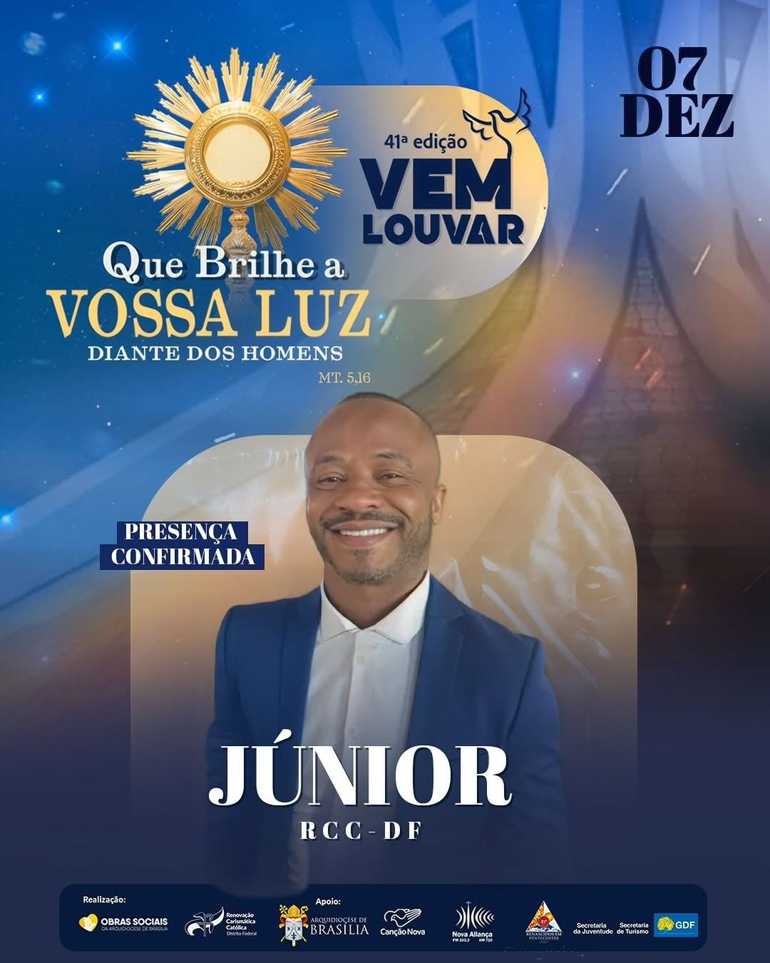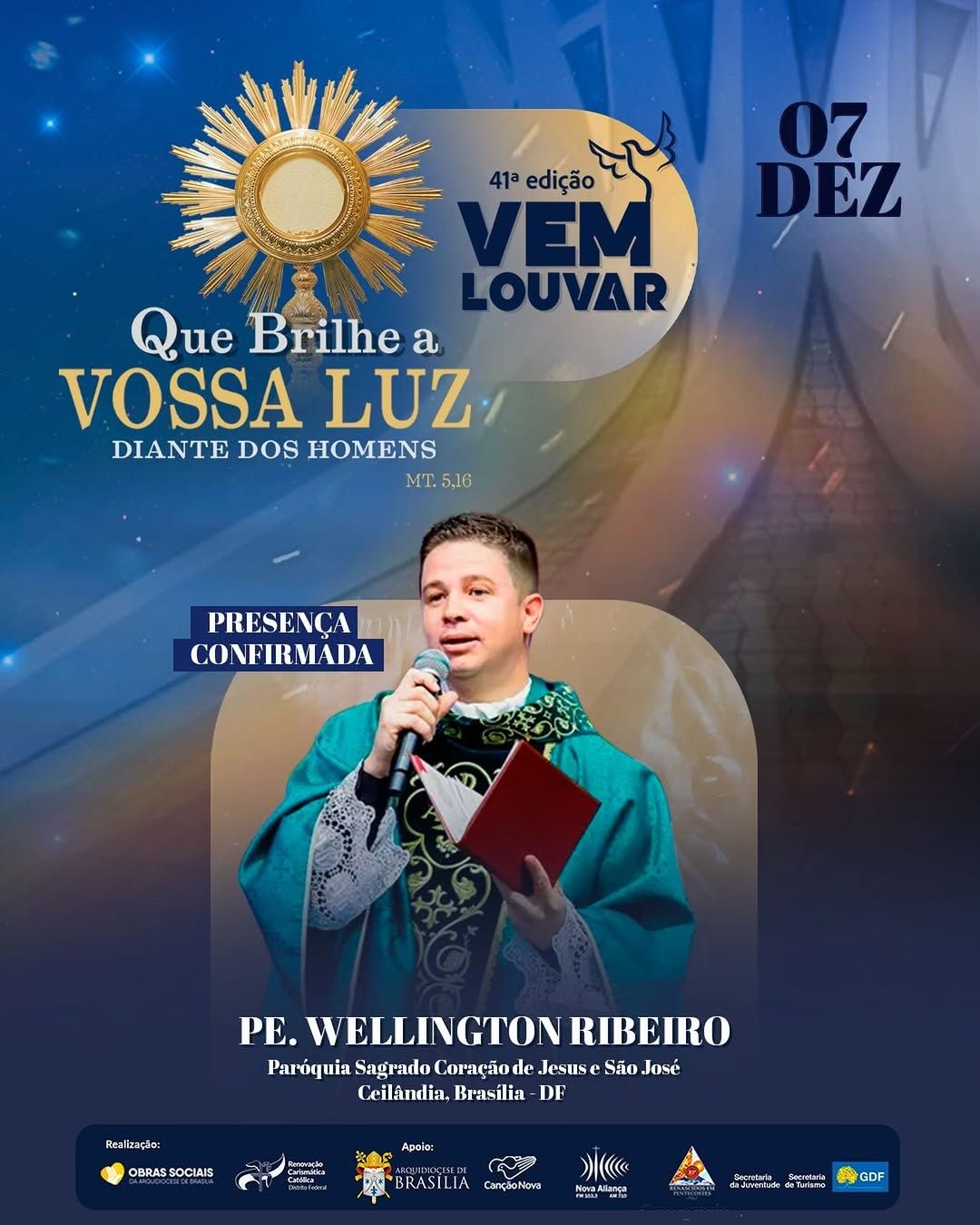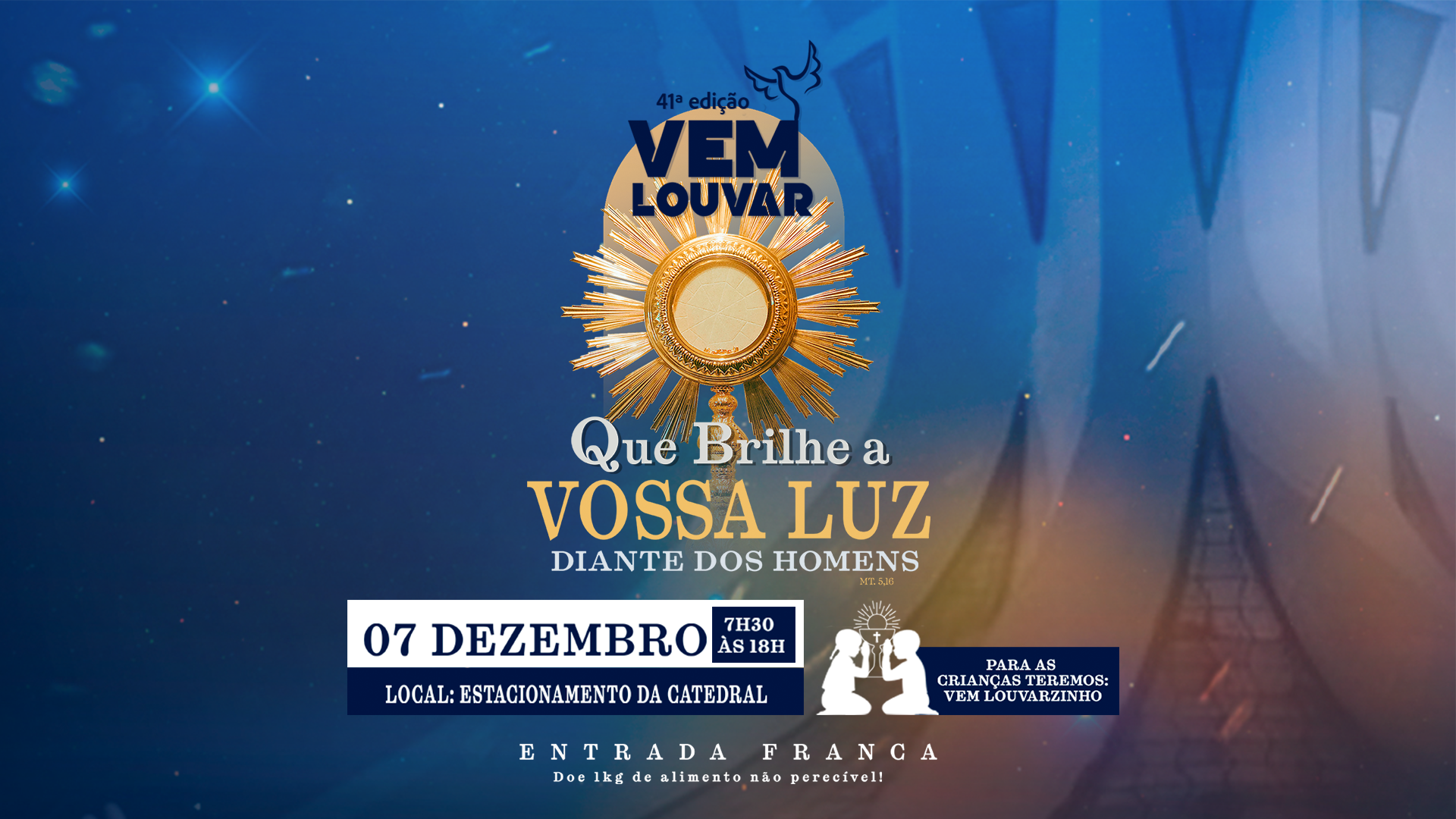 A 41ª edição do VEM LOUVAR acontecerá no dia 7 de dezembro de 2025, com o tema: “QUE BRILHE A VOSSA LUZ DIANTE DOS HOMENS” (Mt 5,16). O evento é promovido pela Renovação Carismática Católica do Distrito Federal, com o apoio da Arquidiocese de Brasília.