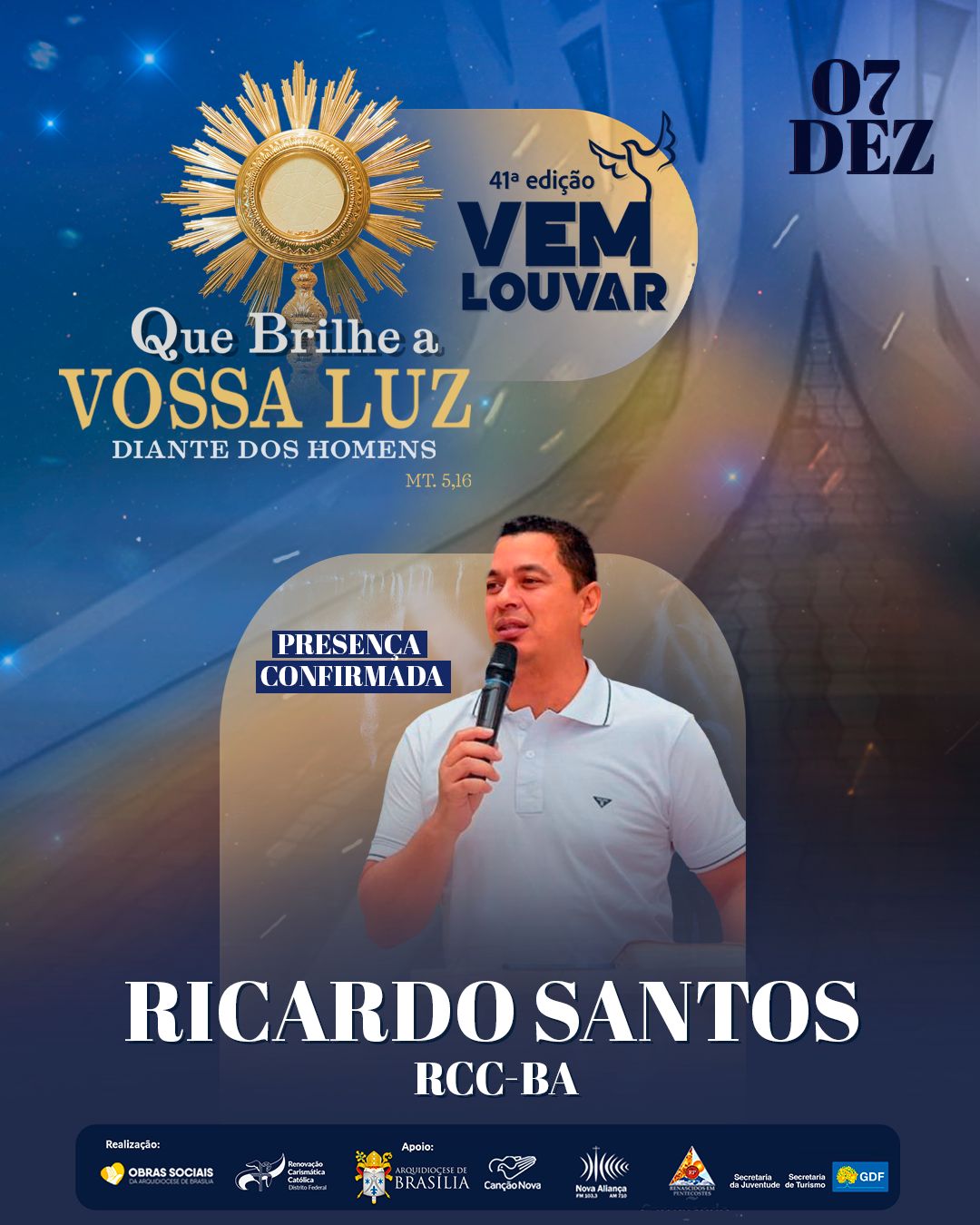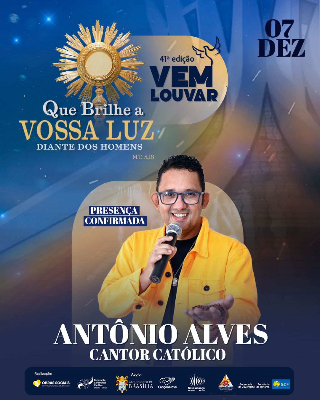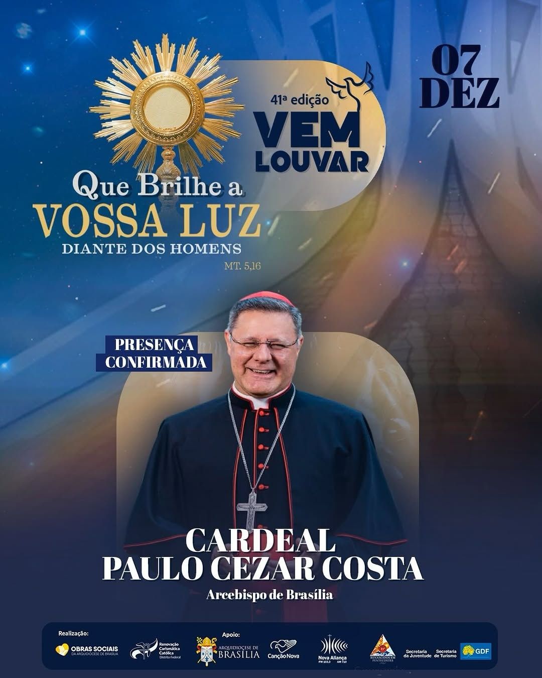 A 41ª edição do VEM LOUVAR acontecerá no dia 7 de dezembro de 2025, com o tema: “QUE BRILHE A VOSSA LUZ DIANTE DOS HOMENS” (Mt 5,16). O evento é promovido pela Renovação Carismática Católica do Distrito Federal, com o apoio da Arquidiocese de Brasília.
